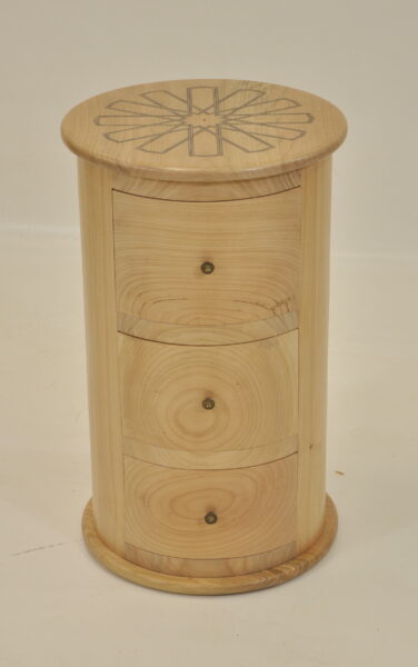 Accueil > Chevet cylindrique - 3 tiroirs, plateau avec filet de marqueterie, en merisier massif, gomme laque, cire. Dimensions : 640x390x390 > Claire