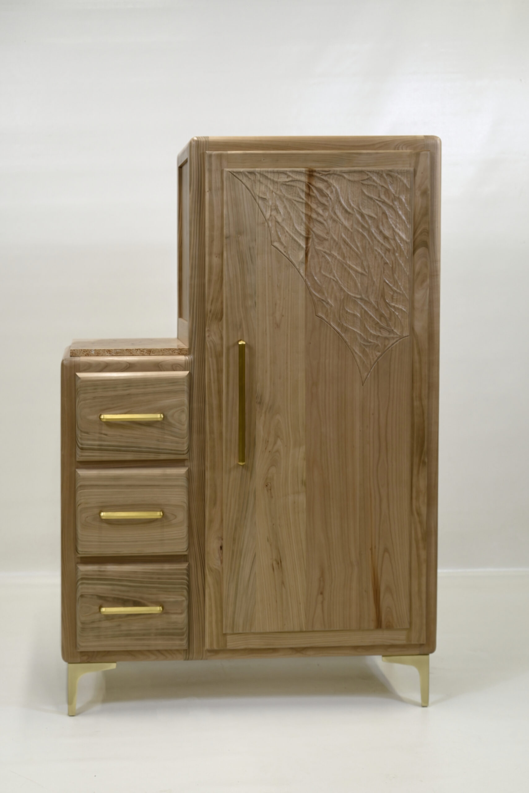 Accueil > Home shoes home - Meuble inspiration Art Déco, en merisier, sculpture sur la porte avec effet de matière en merisier, finition vitrificateur et plateau faux marbre polychrome. Dimensions : 1512x1020x435 > AURELIE