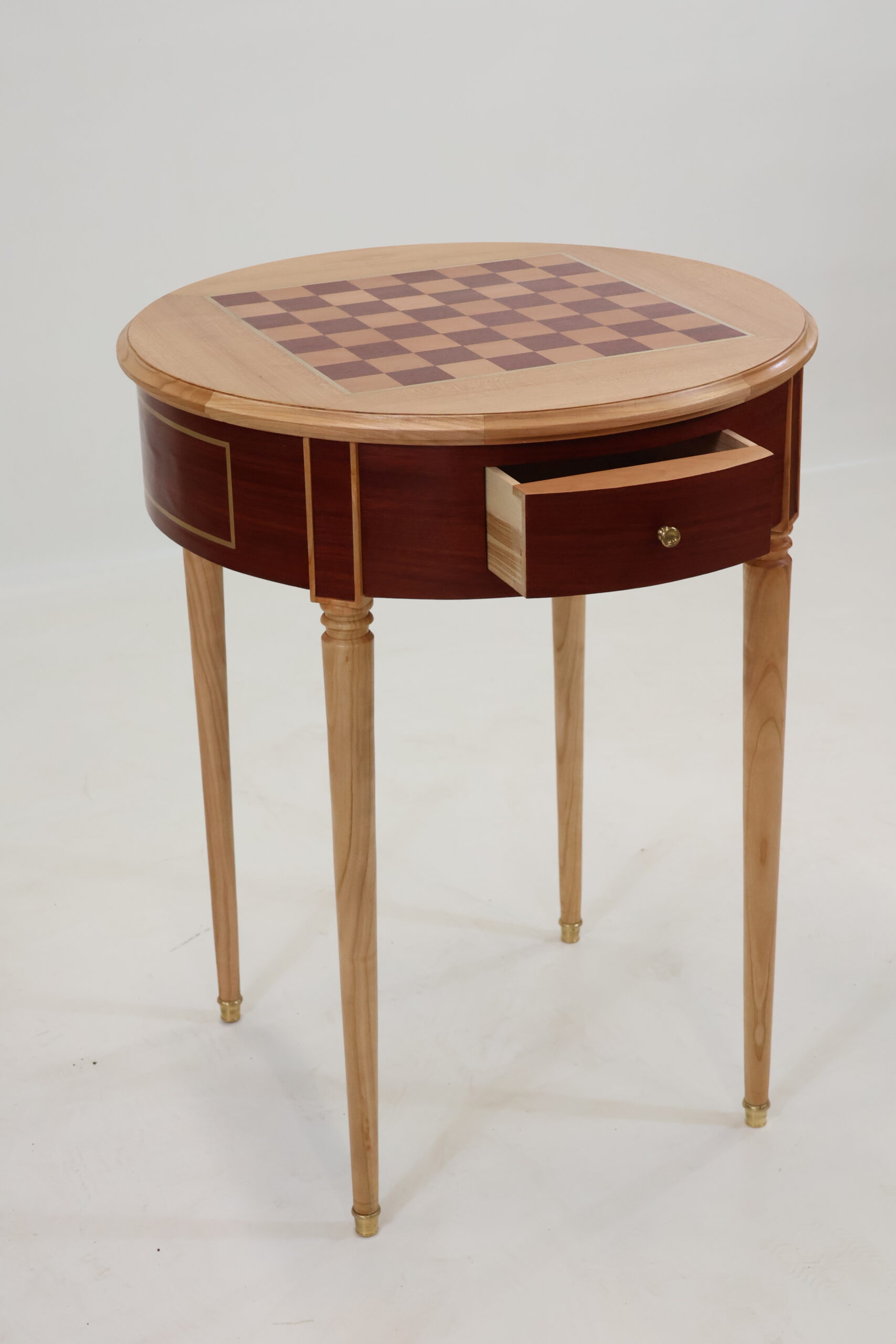 Accueil > "La débutante"- Table à jeux d'inspiration Louis XVI en merisier plaqué et Murapiranga avec incrustation de filets laiton. Dimensions : 790xØ620 > PIERRE