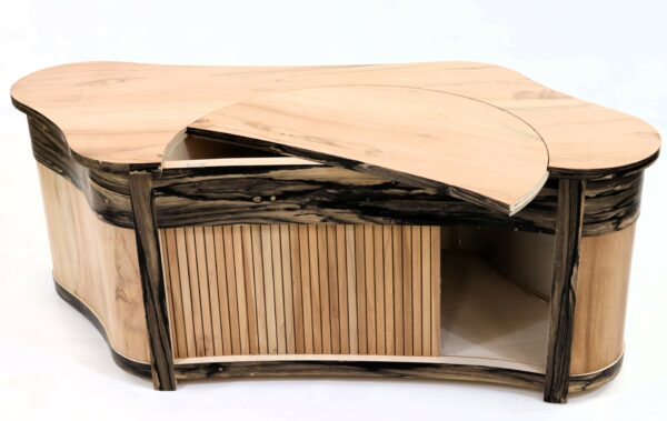 Accueil > "La Fêve" - Meuble contemporain tout en courbe, rideau sur circonférence , ouverture dans plateau, en ziricote, érable ondé et marronnier échauffé. Dimensions : 1400x865x572 > ANTONIN