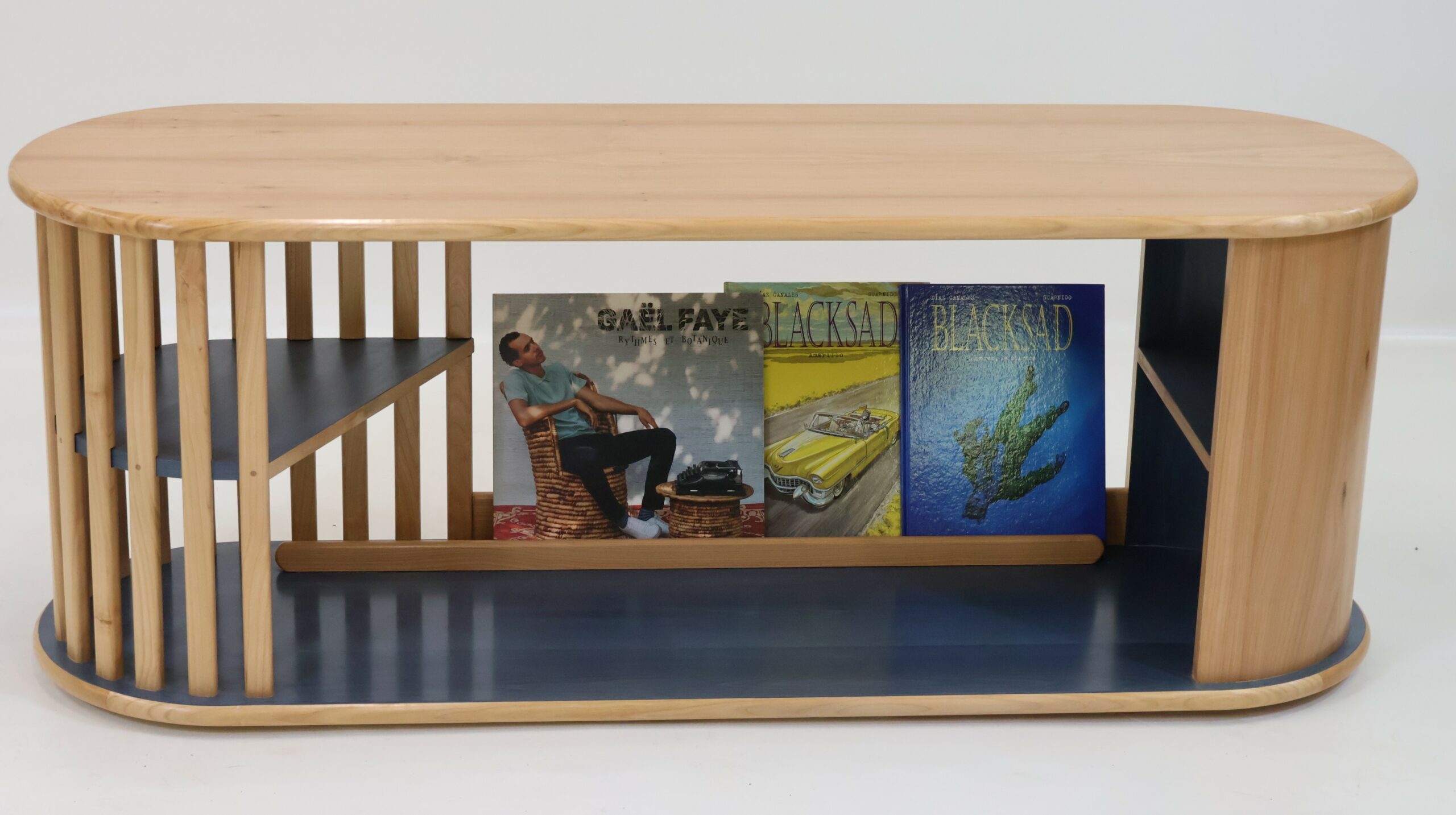 Accueil > Meuble télé en merisier, flexplis, placage, polychromie, gomme laque, cire. Dimensions : 1500x450x550 > LAUREN